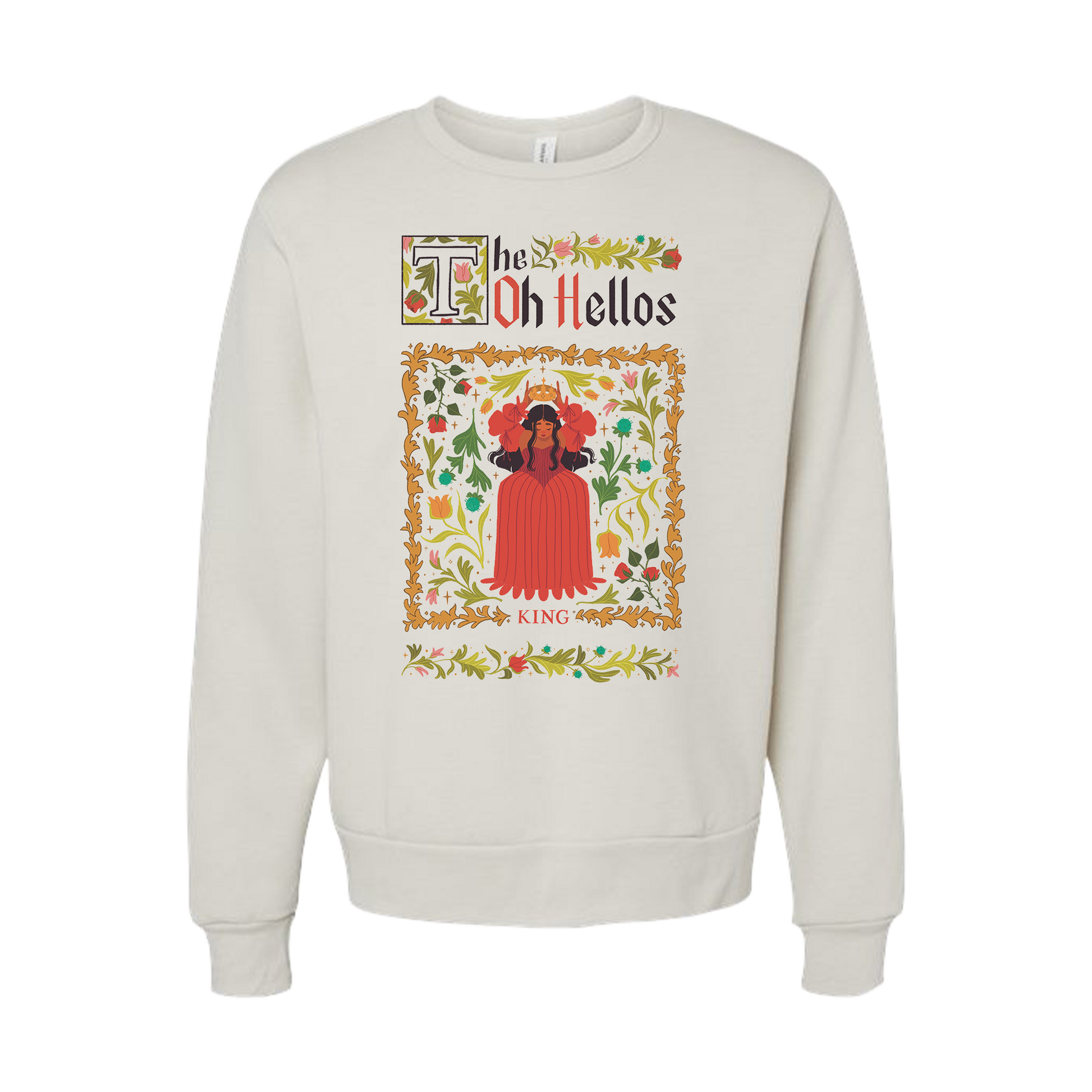 "King" design printed on an ivory crewneck.