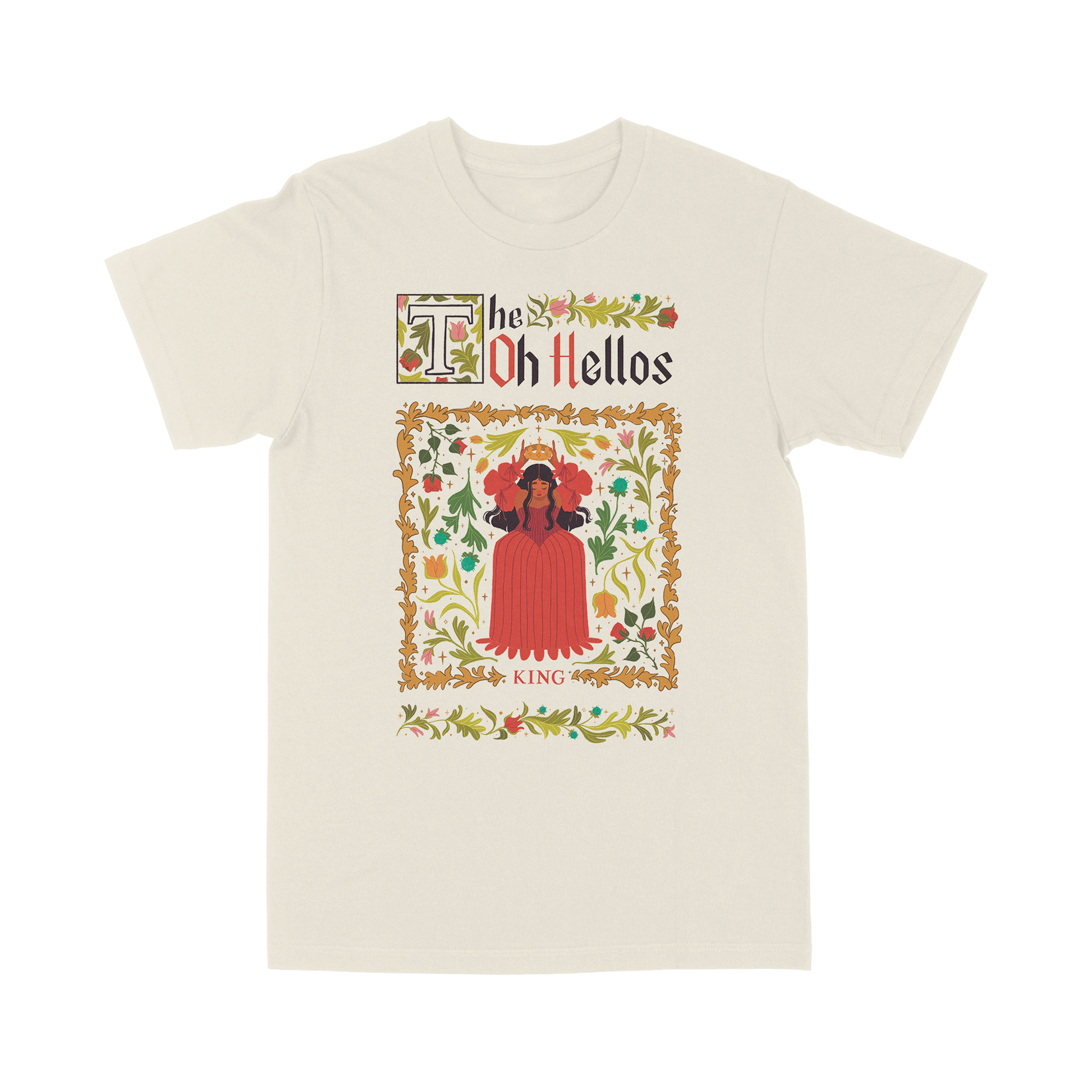 "King" design printed on an ivory 100% cotton t-shirt.