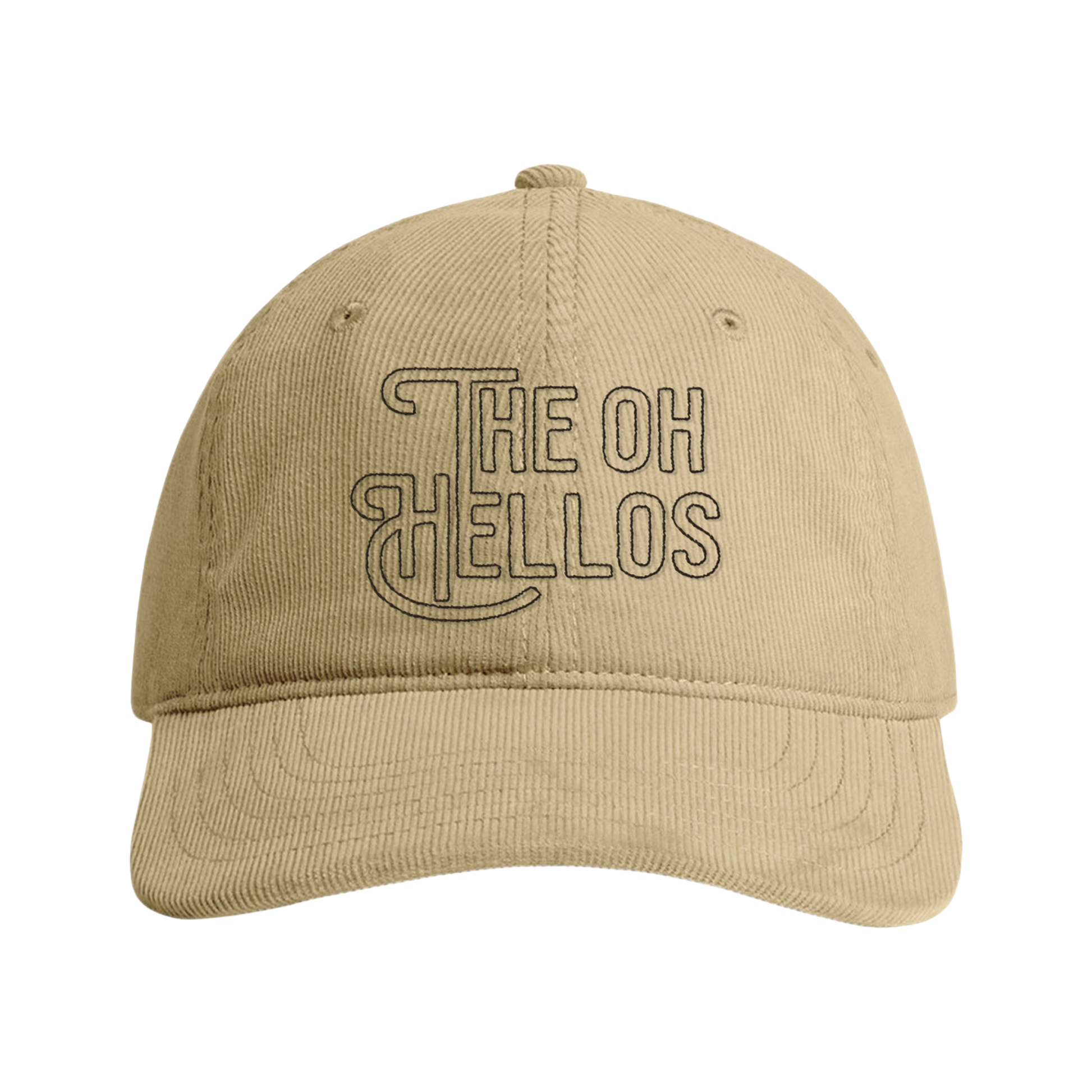 Logo on a khaki cordoroy hat with an adjustable fastener.